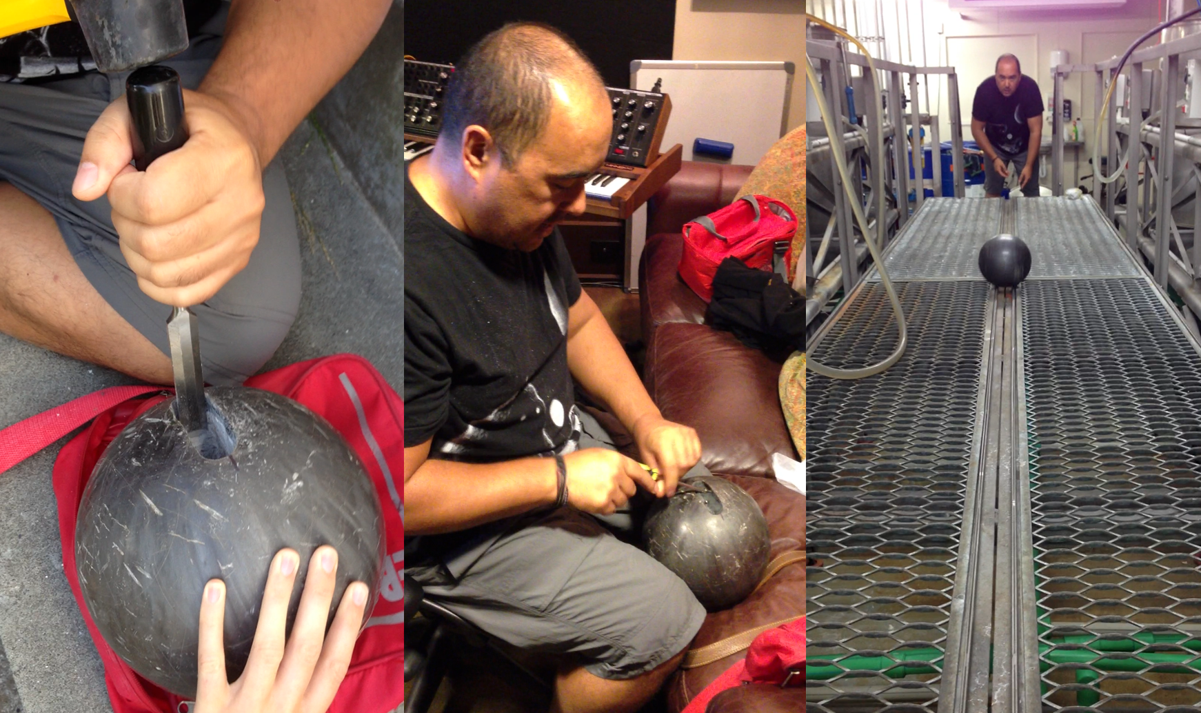Left: Carving a hole in a bowling ball to fit a Sony M10 recorder in. Centre: Screws to keep the recorder in place. Right: Metallic motion.
